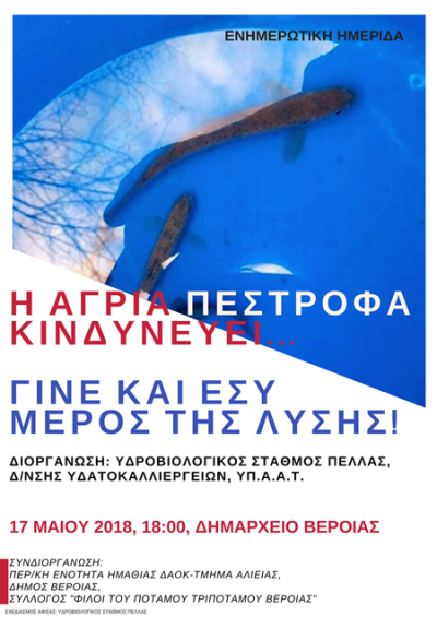 Ο Υδροβιολογικός Σταθμός Πέλλας σε συνεργασία με το Τμήμα Αλιείας ΔΑΟΚ, Περιφερειακή Ενότητα Ημαθίας, το Δήμο Βέροιας και το σύλλογο «Φίλοι του ποταμού Τριπόταμου Βέροιας θα πραγματοποιήσει ημερίδα στις 17/05/2018, ώρα 18:00 μ.μ., στην αίθουσα συνεδριάσεων του δημοτικού συμβουλίου στο δημαρχείο Βέροιας, με θέμα: