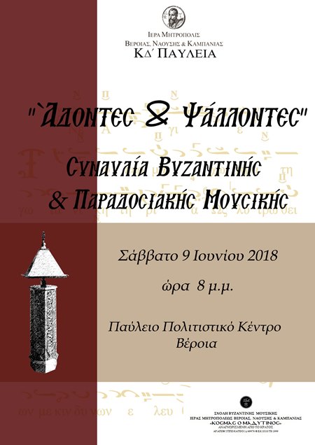 Το Ωδείο της Ιεράς Μητροπόλεως Βεροίας, Ναούσης & Καμπανίας, στα πλαίσια των ΚΔ’ ΠΑΥΛΕΙΩΝ διοργανώνει μαθητική επίδειξη με τίτλο “Άδοντες & Ψάλλοντες” η οποία θα πραγματοποιηθεί το Σάββατο 9 Ιουνίου 2018 και ώρα 8 μ.μ. στο Παύλειο Πολιτιστικό Κέντρο – Βέροια.