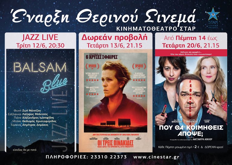 Η έναρξη των Θερινών εκδηλώσεων και προβολών θα γίνει την Τρίτη 12/6 με τους Balsam Blue, στις 13/6 ΔΩΡΕΑΝ προβολή με την ταινία Οι τρεις Πινακίδες Έξω από το Έμπινγκ Στο Μιζούρι και συνεχίζουμε με την καλύτερη κωμωδία του καλοκαιριού στις 14/6 «Που θα κοιμηθείς απόψε».