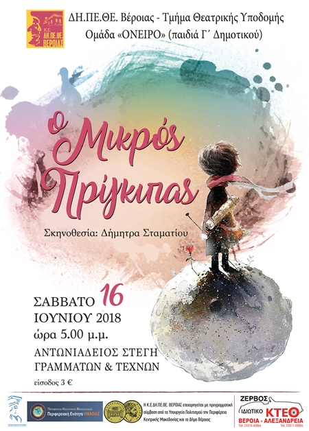 Η Ομάδα «Όνειρο» (παιδιά Γ’ Δημοτικού) του Τμήματος Θεατρικής Υποδομής του ΔΗ.ΠΕ.ΘΕ. Βέροιας παρουσιάζουν την παράσταση “Ο Μικρός Πρίγκιπας”, του Αντουάν ντε Σαιντ Εξυπερύ, σε διασκευή και σκηνοθεσία Δήμητρας Σταματίου. Η παράσταση θα δοθεί το Σάββατο 16 Ιουνίου 2018 στις 5.00μ.μ. στην Αντωνιάδειο Στέγη Γραμμάτων & Τεχνών, με γενική είσοδο 3€.