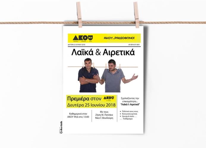 Νέα ραδιοφωνική εκπομπή με τίτλο «Λαϊκά και Αιρετικά», με παρουσιαστές τους Ζήση Μ. Πατσίκα και το Νίκο Βουδούρη θα κάνει πρεμιέρα την Δευτέρα 25 Ιουνίου 2018, στο ραδιόφωνο ΑΚΟΥ 99,6.