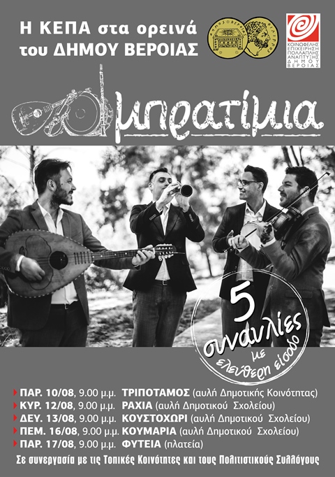 Το καλοκαίρι είναι εδώ και προαναγγέλλει γλέντια, χαρές και πανηγύρια! Φέτος τον Αύγουστο πέντε συναυλίες της ΚΕΠΑ – μία ενιαία παραγωγή- είναι αφιερωμένες σε πέντε όμορφα ορεινά χωριά του Δήμου μας . Από 10 έως και 17 Αυγούστου πέντε δημοτικές κοινότητες θα πλημμυρίσουν από αγαπημένους ήχους και ακούσματα , σε πέντε εκδηλώσεις με ελεύθερη είσοδο. Μένοντας πιστοί στο πνεύμα που υπηρετούμε , η γιορτή αυτή οργανώνεται από κοινού και σε συνεργασία με τις Τοπικές Κοινότητες και τους Τοπικούς Πολιτιστικούς Συλλόγους και εντάσσεται σ΄ έναν προγραμματισμό που αντανακλά τη μουσική και την πολιτισμική πολυμορφία , μ’ ένα σχήμα που την αντιπροσωπεύει ! Καλή περιοδεία Μπρατίμια !
