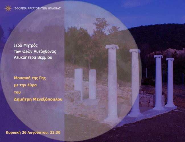 Συναυλία Δημήτρη Μενεξόπουλου. Ο νεαρός μουσικός από τη Θεσσαλονίκη, με γεωλογικές σπουδές στους ήχους της γης, στον ηχητικό σχεδιασμό και την ηλεκτρονική παραγωγή, θα παίξει παραδοσιακή λύρα και θα παρουσιάσει συνθέσεις του στον ιερό χώρο της παλαιότερης μακεδονικής θεάς της γης.