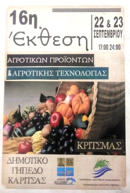 Η φετινή 16η Έκθεση Αγροτικών Προϊόντων, Αγροτικής Τεχνολογίας και Οικοτεχνίας (Γιορτή του Αγρότη – Κριταμά), θα πραγματοποιηθεί το Σαββατοκύριακο στις 22 & 23 Σεπτεμβρίου 2018, στο Δημοτικό Γήπεδο Καρίτσας Πιερίας με συνδιοργανωτές, τον Δήμο Δίου-Ολύμπου και την Περιφερειακή Ενότητα Πιερίας με την συνεργασία των συλλογικών φορέων και πολιτών της περιοχής.