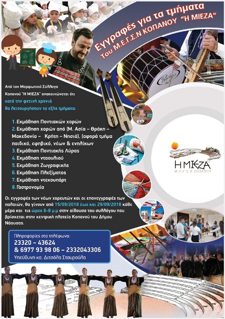 Από τον Μορφωτικό σύλλογο Κοπανού «Η ΜΙΕΖΑ» ανακοινώνεται ότι κατά την φετινή χρονιά θα λειτουργήσουν τα έξης τμήματα: