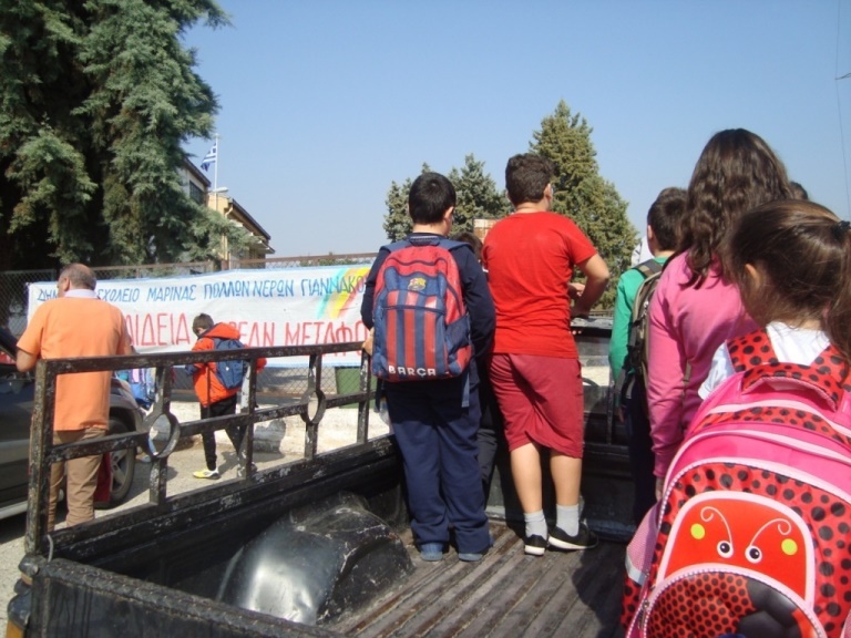 Τριτοκοσμική είναι η εικόνα από τη μεταφορά μικρών μαθητών των Πολλών Νερών Νάουσας Ημαθίας , που για να έχουν πρόσβαση στο δημοτικό σχολείο, μεταφέρονται πάνω σε καρότσα. Πιο συγκεκριμένα, το πρόβλημα της μεταφοράς αφορά μαθητές 5-11 ετών που διαμένουν στον οικισμό Πολλά Νερά και μέχρι στιγμής, το πρόβλημα της μεταφοράς τους στο δημοτικό σχολείο της Μαρίνας δεν έχει λυθεί, οπότε οι μαθητές διασχίζουν τα 5 χιλιόμετρα που τους χωρίζουν από το σχολείο τους πάνω στην καρότσα ενός αγροτικού.