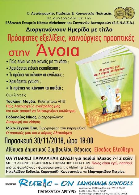 Οι Αντιδημαρχίες Παιδείας & Κοινωνικής Πολιτικής του Δήμου Βέροιας σε συνεργασία με την Ελληνική Εταιρεία Νόσου Alzhaimer και Συγγενών διαταραχών (Ε.Ε.Ν.Α.Σ.Δ), την Παρασκευή 30/11/2018, ώρα 18:00, στην αίθουσα του Δημοτικού Συμβουλίου, διοργανώνουν Ημερίδα με τίτλο: