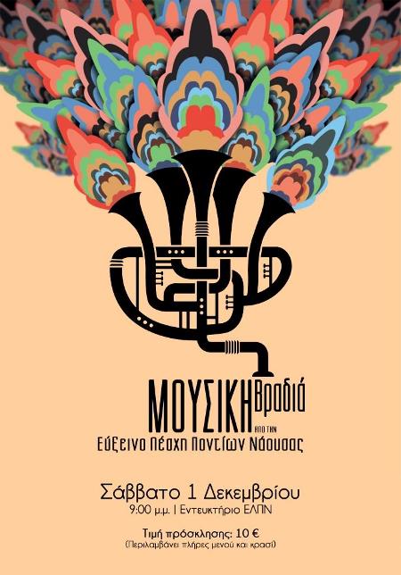 Η Εύξεινος Λέσχη Ποντίων Νάουσας σας προσκαλεί στην εκδήλωση που διοργανώνει, με τίτλο: “Μουσική Βραδιά”. Η εκδήλωση θα πραγματοποιηθεί το Σάββατο 1 Δεκεμβρίου 2018 και ώρα 9:00 μ.μ., στο εντευκτήριο του συλλόγου (Χατζηγρηγοριάδη 30), με πλήθος μουσικών ακουσμάτων από διάφορες περιοχές της Ελλάδας.