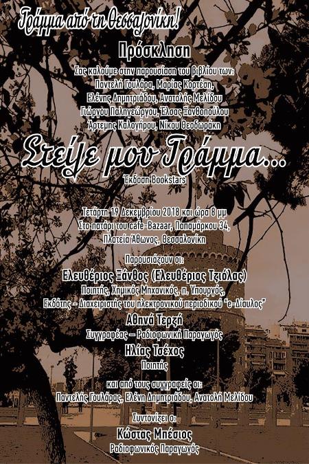Την Τετάρτη 19/12/2018 θα πραγματοποιηθεί η η εκδήλωση παρουσίασης του βιβλίου των: Παντελή Γουλάρα, Μαρίας Κορτέση, Ελένης Δημητριάδου, Ανατολής Μελίδου, Γιώργου Παληγεώργου, Έλσας Ξανθοπούλου, Άρτεμης Καλογήρου, Νίκου Θεοδωράκη, “Στείλε μου Γράμμα…” (έκδοση Bookstars) στη Θεσσαλονίκη, στο πατάρι του cafe -Bazaar, Παπαμάρκου 34, Πλατεία Άθωνος. Η ώρα της εκδήλωσης είναι 8 μμ.