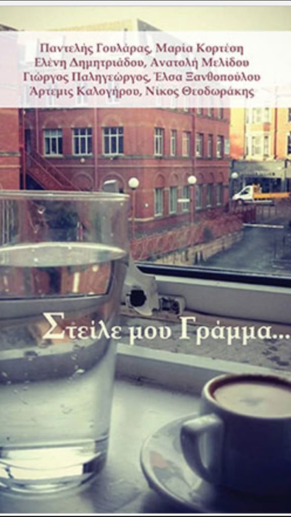 Την Τετάρτη 19/12/2018 θα πραγματοποιηθεί η η εκδήλωση παρουσίασης του βιβλίου των: Παντελή Γουλάρα, Μαρίας Κορτέση, Ελένης Δημητριάδου, Ανατολής Μελίδου, Γιώργου Παληγεώργου, Έλσας Ξανθοπούλου, Άρτεμης Καλογήρου, Νίκου Θεοδωράκη, “Στείλε μου Γράμμα…” (έκδοση Bookstars) στη Θεσσαλονίκη, στο πατάρι του cafe -Bazaar, Παπαμάρκου 34, Πλατεία Άθωνος. Η ώρα της εκδήλωσης είναι 8 μμ.