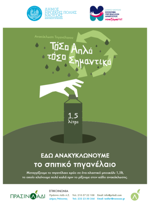 Ενημερωτική εκδήλωση για την παρουσίαση του πιλοτικού προγράμματος ανακύκλωσης οικιακού τηγανέλαιου οργανώνει ο Δήμος Νάουσας μαζί με την Εταιρία «Πράσινο Λάδι», την Τετάρτη 16 Ιανουαρίου 2019, στις 19.30, στον Πολυχώρο Πολιτισμού Χρήστος Λαναράς αίθουσα ΒΕΤΛΑΝΣ.