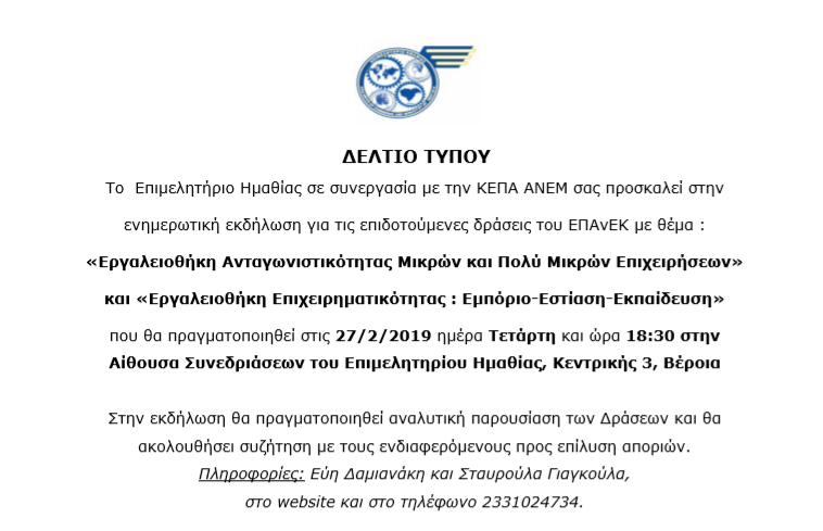 Εκδηλώσεις Τοπικά Πρόσκληση σε ενημερωτική εκδήλωση του Επιμελητηρίου Ημαθίας Faretra.info 23/02/2019, 08:06 Share on Facebook Share on Twitter Send with mail Φαρέτρα Επιμελητήριο Ημαθίας ΣΧΕΤΙΚΑ ΑΡΘΡΑ Δεν υπάρχουν σχετικά άρθρα.