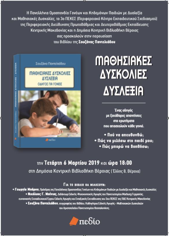 Η Ομοσπονδία Συλλόγων Γονέων Παιδιών με Δυσλεξία & Μαθησιακές Δυσκολίες, το 3ο ΠΕΚΕΣ (Περιφερειακό Κέντρο Εκπαιδευτικού Σχεδιασμού) της Περιφερειακής Διεύθυνσης Πρωτοβάθμιας και Δευτεροβάθμιας Εκπαίδευσης Κεντρικής Μακεδονίας και η Δημόσια Κεντρική Βιβλιοθήκη Βέροιας σας προσκαλούν στην παρουσίαση του βιβλίου της Σουζάνας Παντελιάδου: