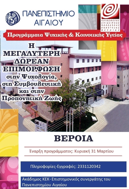 Παρακαλούμε να διαδώσετε σε φίλους και γνωστούς σας τη μεγαλύτερη ΔΩΡΕΑΝ επιμορφωτική δράση του Πανεπιστημίου Αιγαίου τώρα και στη Βέροια!