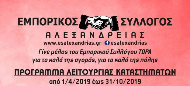 Αλεξάνδρεια Ειδήσεις με Διάρκεια Θερινό και Πρόγραμμα Πάσχα Λειτουργίας Καταστημάτων Αλεξάνδρειας Faretra.info 28/03/2019, 14:52 Share on Facebook Share on Twitter Send with mail Φαρέτρα Εμπορικός Σύλλογος Αλεξάνδρειας ΣΧΕΤΙΚΑ ΑΡΘΡΑ Δεν υπάρχουν σχετικά άρθρα.