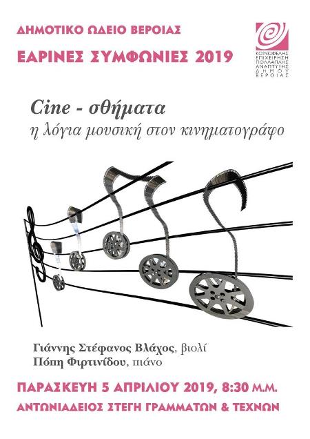 Mε λύπη σας ανακοινώνουμε ότι η μουσική εκδήλωση : «Cine- σθήματα : η λόγια μουσική στον Κινηματογράφο» με το duo Πόπη Φιρτινίδου και Γιάννη Βλάχο , που επρόκειτο να πραγματοποιηθεί την Παρασκευή 5/4 στην Αντωνιάδειο Στέγη Γραμμάτων και Τεχνών και στο πλαίσιο των ΕΑΡΙΝΩΝ ΣΥΜΦΩΝΙΩΝ του Δ.Ω.Β. , ακυρώνεται , λόγω ξαφνικού οικογενειακού προβλήματος ενός εκ των συντελεστών.