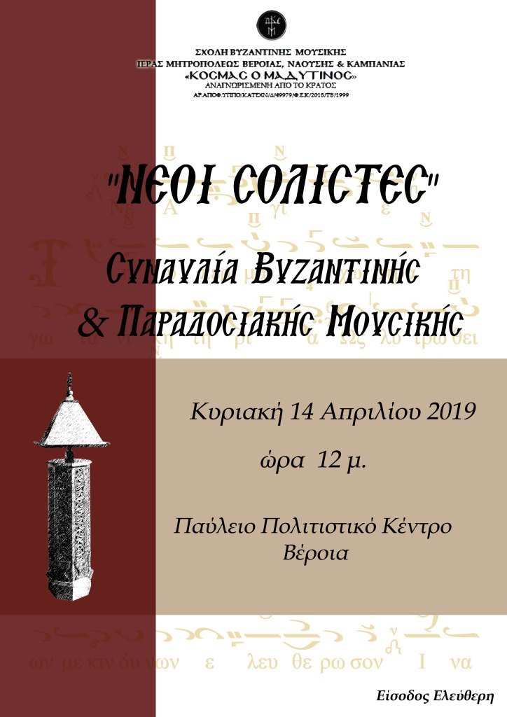 Η Σχολή Βυζαντινής Μουσικής της Ιεράς Μητροπόλεως Βεροίας, Ναούσης & Καμπανίας “Κοσμάς ο Μαδυτινός”, διοργανώνει μαθητική επίδειξη που θα πραγματοποιηθεί την Κυριακή 14 Απριλίου 2019, και ώρα 12 μ., στο Παύλειο Πολιτιστικό Κέντρο Βέροιας.