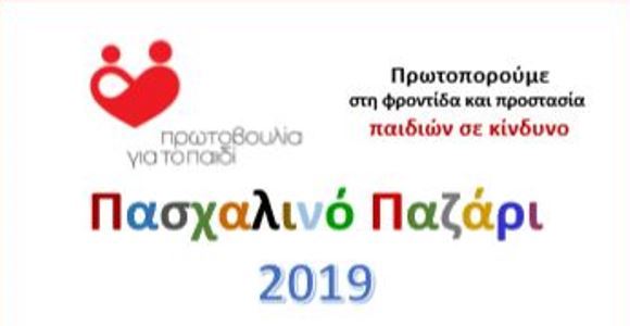 Η Πρωτοβουλία για το Παιδί ανακοινώνει τη διεξαγωγή του τακτικού Πασχαλιάτικου Bazaar της, που θα γίνει στο επί της οδού Π. Τσαλδάρη 30 κατάστημα, από τη Δευτέρα 15 Απριλίου 2019 έως και τη Μ. Παρασκευή 26 Απριλίου 2019.