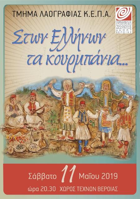 Σας προσκαλούμε το Σάββατο 11/5/2019, ώρα: 8.30μ.μ. στο Χώρο Τεχνών. Θα περιηγηθούμε με το τμήμα λαογραφίας της Κ.Ε.Π.Α. Δήμου Βέροιας σε περιοχές που το έθιμο αναβιώνει έως τις μέρες μας. Η θυσία ενός ζώου προς τιμήν ενός αγίου έχει τις ρίζες της στην αρχαιότητα.