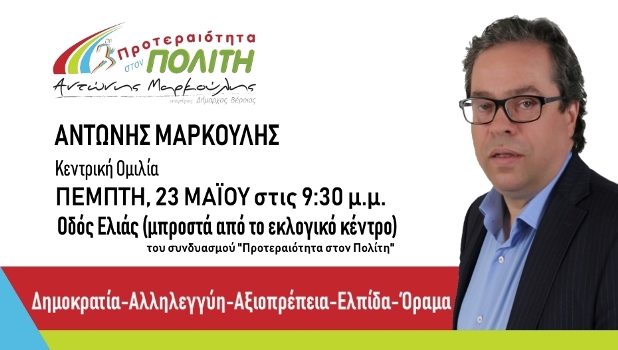 Σας προσκαλώ στην κεντρική προεκλογική ομιλία μου, που θα πραγματοποιηθεί την Πέμπτη, 23 Μαΐου 2019 στις 9:30 μ.μ., στην οδό Ελιάς, μπροστά από το εκλογικό κέντρο του συνδυασμού «Προτεραιότητα στον Πολίτη».