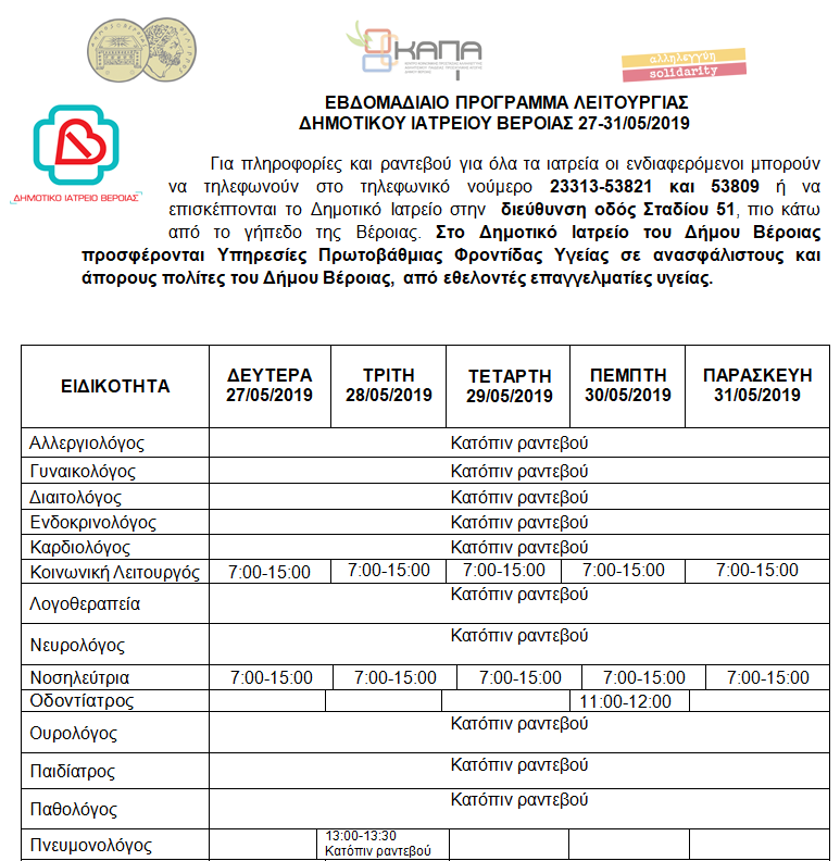 Βέροια Ειδήσεις με Διάρκεια Δημοτικό Ιατρείο Βέροιας. Πρόγραμμα λειτουργίας από 27 έως και 31 Μαΐου Faretra.info 25/05/2019, 08:49 Share on Facebook Share on Twitter Send with mail Φαρέτρα ΣΧΕΤΙΚΑ ΑΡΘΡΑ Δεν υπάρχουν σχετικά άρθρα.