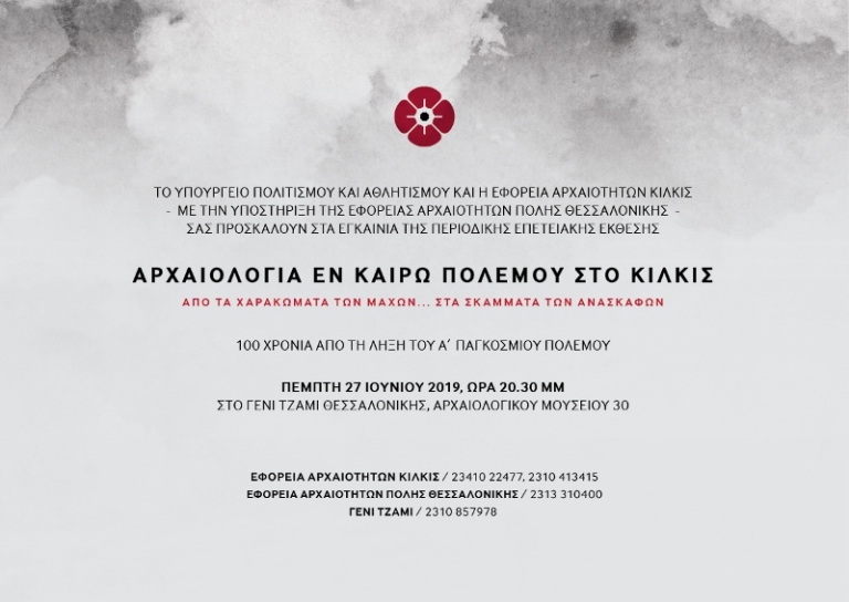 Πρόσκληση για τα εγκαίνια της περιοδικής επετειακής έκθεσης “Αρχαιολογία εν καιρώ πολέμου στο Κιλκίς. Από τα χαρακώματα των μαχών…στα σκάμματα των ανασκαφών”, την Πέμπτη 27 Ιουνίου 2019, στις 20.30, στο Γενί Τζαμί στη Θεσσαλονίκη (Αρχαιολ. Μουσείου 30).