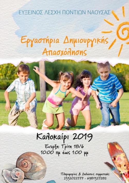 Για ακόμη μία χρονιά η Εύξεινος Λέσχη Ποντίων Νάουσας – Εθνική Βιβλιοθήκη Αργυορουπόλεως, ανακοινώνει την έναρξη του Θερινού Προγράμματος Δημιουργικής Απασχόλησης της βιβλιοθήκης της, την Τρίτη 18 Ιουνίου 2019.