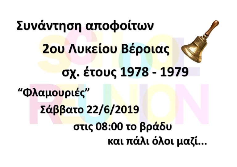 Εχει δημιουργηθεί εκδήλωση στο facebook με όνομα: “Συνάντηση Συμμαθητών 2ου Λυκείου έτους αποφοίτησης 1979“