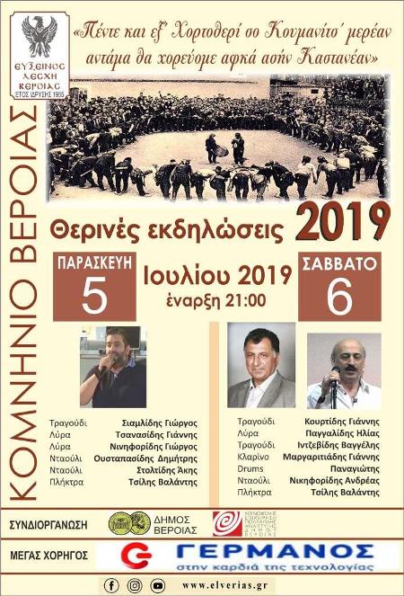 Συνεχίζοντας την προσπάθειά μας για την διάδοση και διατήρηση της πολιτιστικής μας κληρονομιάς, θα πραγματοποιήσουμε θερινές μουσικοχορευτικές εκδηλώσεις στις 5 & 6 Ιουλίου 2019, στο Κομνήνιο Βέροιας.