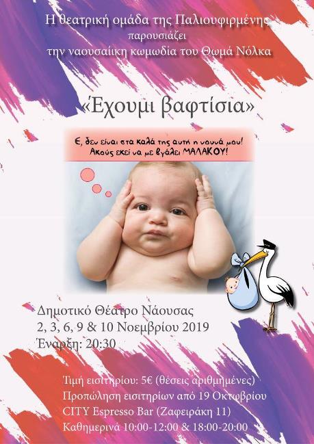 Αυτός είναι ο τίτλος της νέας παράστασης της θεατρικής ομάδας της «Παλιουφιρμένης». Πρόκειται για την τέταρτη αυτόνομη θεατρική παρουσία της ομάδας στην πόλη μας. Η αρχή έγινε το 2012 με την «ΠΑΛΙΟΥΦΙΡΜΕΝΗ», ακολούθησε «ΤΟ ΠΡΟΞΕΝΙΟ ΤΗΣ ΝΑΝΑΣ» το 2014 και δυο χρόνια αργότερα το έργο «ΒΓΑΛΤΑ ΚΙ ΕΡΧΟΥΜΙ». Τώρα σειρά παίρνει η νέα Ναουσαίικη κωμωδία του Θωμά Νόλκα με τίτλο «ΕΧΟΥΜΙ ΒΑΦΤΙΣΙΑ».