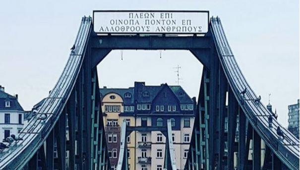 Ο στίχος του Ομήρου «Πλέων επί οινόπα πόντον επ΄ αλλοθρόους ανθρώπους» (Πλέοντας μέσα στο μελανό πέλαγος με αλλόγλωσσους ανθρώπους) δεσπόζει στη σιδερένια πεζογέφυρα της Φρανκφούρτης που ενώνει τις δύο όχθες του ποταμού Μάϊν.