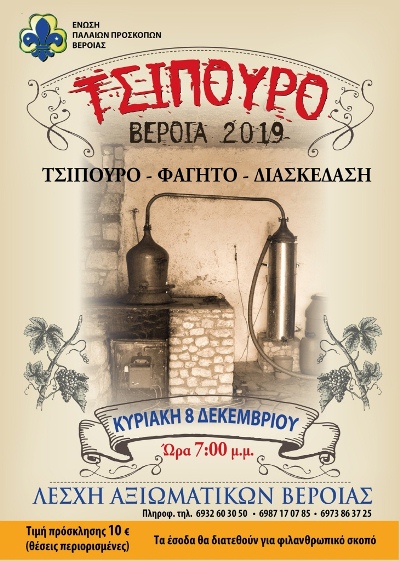 Η Ένωση Παλαιών Προσκόπων Βέροιας, διοργανώνει για 6η χρονιά μια βραδιά αφιερωμένη στο τσίπουρο, τον μεζέ του και τη διασκέδαση, την Κυριακή 8 Δεκεμβρίου 2019 στις 7.00 μ.μ. στη Λέσχη Αξιωματικών Φρουράς Βέροιας.