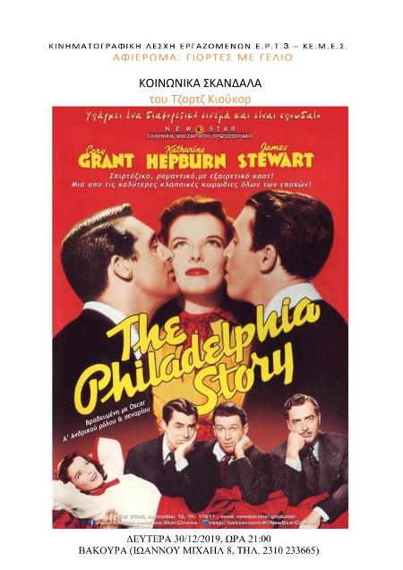 Εκλεκτό οσκαρικό χιούμορ τη Δευτέρα 30 Δεκεμβρίου στις 21:00 στο σινε ΒΑΚΟΥΡΑ από την κινηματογραφική λέσχη εργαζομένων της ΕΡΤ3 και το ΚΕΜΕΣ, με την περίφημη, κλασική κομεντί «Κοινωνικά σκάνδαλα» («The Philadelphia story», ασπρόμαυρο, ΗΠΑ, 1940) σε σκηνοθεσία Τζορτζ Κιούκορ και σενάριο Ντόναλντ Όγκντεν Στιούαρτ από το ομώνυμο θεατρικό έργο του Φίλιπ Μπάρι. Πρωταγωνιστούν οι Κάρι Γκραντ, Κάθριν Χέπμπορν, Τζέιμς Στιούαρτ και Ρουθ Χάσεϊ. Απέσπασε 2 βραβεία Όσκαρ, α’ ανδρικού ρόλου (Στιούαρτ) και σεναρίου, ενώ είχε και άλλες 4 υποψηφιότητες, για καλύτερη ταινία, α’ γυναικείου (Χέπμπορν), β’ γυναικείου (Χάσεϊ) και σκηνοθεσίας.