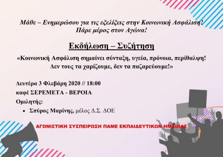 Η Αγωνιστική Συσπείρωση Εκπαιδευτικών – ΠΑΜΕ Ημαθίας σας προσκαλεί σε εκδήλωση – συζήτηση για το Ασφαλιστικό.