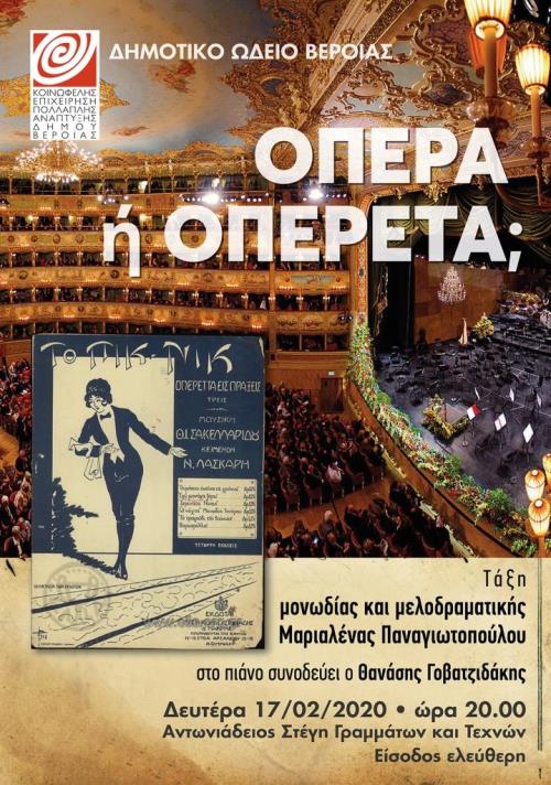 Δυο εκδοχές μουσικού θεάτρου θα έχουν την ευκαιρία να παρακολουθήσουν όσοι παραβρεθούν στην παράσταση της τάξης μονωδίας και μελοδραματικής της Μαριαλένας Παναγιωτοπούλου, τη Δευτέρα 17 Φεβρουαρίου 2020, στις 8μ.μ. στην Αντωνιάδειο Στέγη Γραμμάτων και Τεχνών. Θα ερμηνευθούν άριες από γνωστές όπερες του κλασικού ρεπερτορίου με κοστούμια και σκηνικά εποχής. Τους ανεκπλήρωτους έρωτες και τις κωμικές παρεξηγήσεις που διαδραματίζονται στο πρώτο μέρος διαδέχονται τα χρόνια τις αθωότητας μέσα από τις ελληνικές οπερέτες οι οποίες ήταν το κύριο μέσο διασκέδασης της εποχής του μεσοπολέμου.