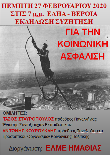 Η ΕΛΜΕ Ημαθίας προσκαλεί όλους τους συναδέλφους και κάθε ενδιαφερόμενο στην ενημερωτική εκδήλωση συζήτηση με θέμα την κοινωνική ασφάλιση, που θα πραγματοποιηθεί την Πέμπτη 27 Φεβρουαρίου 2020 στις 7μ.μ. στο χώρο Εληά στη Βέροια με ομιλητές τους ΤΑΣΟ ΣΤΑΥΡΟΠΟΥΛΟ, Πρόεδρο της Πανελλήνιας Ένωσης Συνταξιούχων Εκπαιδευτικών και ΑΝΤΩΝΗ ΚΟΥΡΟΥΚΛΗ, πρόεδρο της Πανελλήνιας Ομοσπονδίας Προσωπικού Οργανισμών Κοινωνικής Πολιτικής.