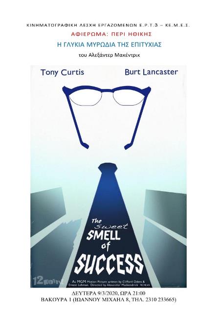 Διπλή απόλαυση για τους σινεφίλ τη Δευτέρα 9 Μαρτίου στο cine ΒΑΚΟΥΡΑ από την κινηματογραφική λέσχη εργαζομένων ΕΡΤ3 και το ΚΕΜΕΣ. Αρχικά, στις 21:00 ο Πάρις Παρασχόπουλος και το συγκρότημά του θα παρουσιάσουν μελοποιημένα ποιήματα που έγραψαν κρατούμενες στις γυναικείες φυλακές Διαβατών. Στις 22:00, στο πλαίσιο του αφιερώματος «Περί ηθικής», θα προβληθεί το εκπληκτικό φιλμ του Αλεξάντερ Μακέντρικ, «Η γλυκιά μυρωδιά της επιτυχίας» (Sweet Smell of Success, ασπρόμαυρο, ΗΠΑ, 1957, διάρκεια 96´) σε σενάριο Κλίφορντ Όντετς και Έρνεστ Λέμαν από μυθιστόρημα του τελευταίου. Παίζουν οι Μπαρτ Λανκάστερ, Τόνι Κέρτις, Σούζαν Χάρισον, Μάρτιν Μίλνερ. Για την ερμηνεία του στην ταινία ο Τόνι Κέρτις ήταν υποψήφιος για βραβείο BAFTA καλύτερου ξένου ηθοποιού.