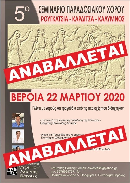 το προγραμματισμένο σεμινάριο χορού που θα ελάμβανε χώρα στις εγκαταστάσεις της Ευξείνου Λέσχης Βέροιας, την 22 Μαρτίου 2020.