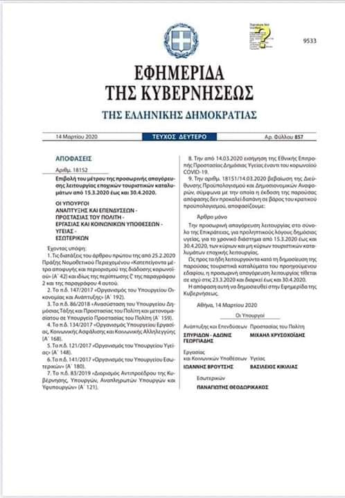Συγκεκριμένα με ΚΥΑ, υπό τον τίτλο: «Επιβολή του μέτρου της προσωρινής απαγόρευσης λειτουργίας εποχικών τουριστικών καταλυμάτων από 15.3.2020 έως και 30.4.2020», που δημοσιεύθηκε σε ΦΕΚ, αποφασίζεται: «Η προσωρινή απαγόρευση λειτουργίας στο σύνολο της Επικράτειας, για προληπτικούς λόγους δημόσιας υγείας, για το χρονικό διάστημα από 15.3.2020 έως και 30.4.2020, των κύριων και μη κύριων τουριστικών καταλυμάτων εποχικής λειτουργίας. Ως προς τα ήδη λειτουργούντα κατά τη δημοσίευση της παρούσας τουριστικά καταλύματα του προηγούμενου εδαφίου, η προσωρινή απαγόρευση λειτουργίας τίθεται σε ισχύ στις 23.3.2020 και διαρκεί έως και 30.4.2020».