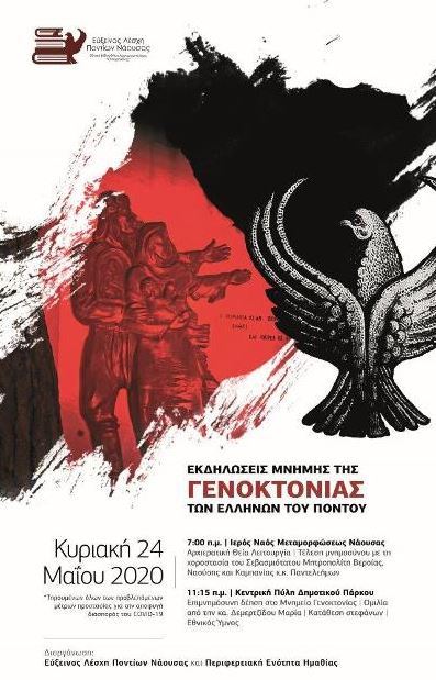 Η Εύξεινος Λέσχη Ποντίων Νάουσας – Εθνική Βιβλιοθήκη Αργυρουπόλεως «Ο Κυριακίδης» και η Περιφερειακή Ενότητα Ημαθίας, τιμώντας την ημέρα Μνήμης της Γενοκτονίας του Ποντιακού Ελληνισμού, διοργανώνουν Εκδηλώσεις Μνήμης της Γενοκτονίας των Ελλήνων του Πόντου την Κυριακή 24 Μαΐου 2020. Το πρόγραμμα των εκδηλώσεων έχει ως εξής: