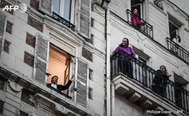 French opera tenor singer Stephane Senechal performs the 'O Sole Mio' from his window in Paris on the 10th day of a strict lockdown in France aimed at curbing the spread of COVID-19