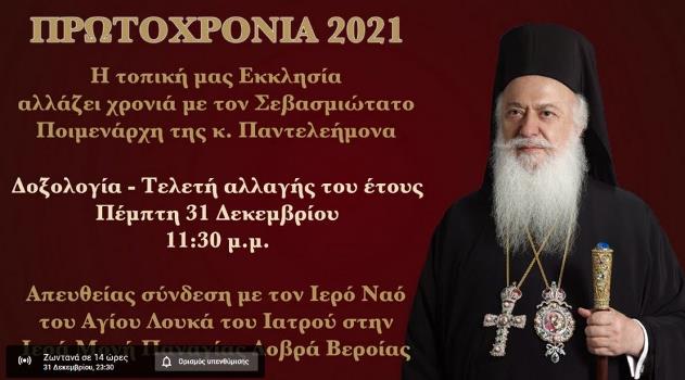 Παρακολουθήστε σε απευθείας σύνδεση σήμερα Πέμπτη 31 Δεκεμβρίου στις 11:30 μ.μ. την Δοξολογία – Τελετή αλλαγής του έτους χοροστατούντος του Σεβασμιωτάτου Μητροπολίτου Βεροίας, Ναούσης και Καμπανίας κ. Παντελεήμονος από τον υπό κατασκευή Ιερό Ναό του Αγίου Λουκά του Ιατρού στην Ιερά Μονή Παναγίας Δοβρά Βεροίας.