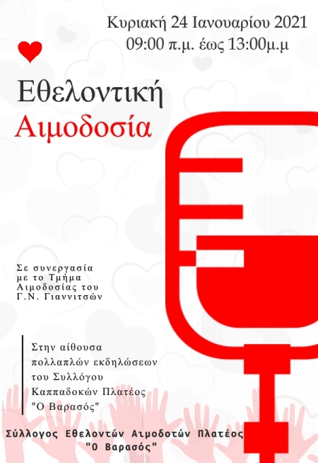 Ο Σύλλογος Εθελοντών Αιμοδοτών Πλατέος Ημαθίας “Ο Βαρασός” με αίσθημα ευθύνης απέναντι στο κοινωνικό σύνολο, διοργανώνει την 7η εθελοντική αιμοδοσία, για την διαφύλαξη της ανθρώπινης ζωής και της υγείας, που αποτελούν ύψιστο αγαθό και δικαίωμα για όλους.