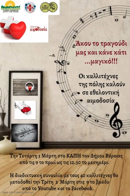 Τις φωνές τους ενώνουν 40 καλλιτέχνες της πόλης μας μαζί με το ΚΕΠ Υγείας του Δήμου Βέροιας σε μία προσπάθεια να «ενώσουν» ακόμα περισσότερους πολίτες στην ενίσχυση των αποθεμάτων αίματος για τις ανάγκες των νοσοκομείων.