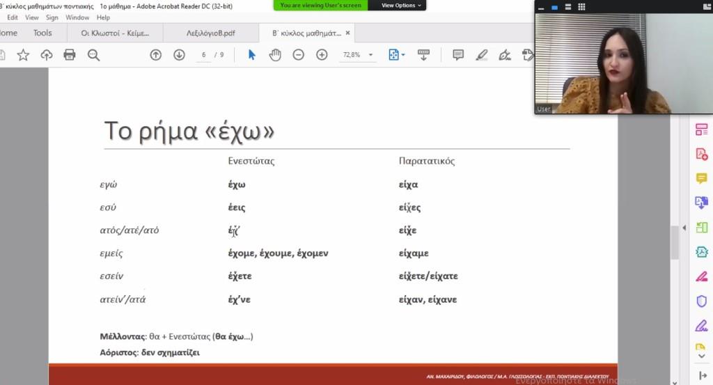 Το θεωρητικό μέρος του περιλάμβανε την κλίση των βασικών ρημάτων είμαι, έχω και ‘ίνουμαι, λαμβάνοντας υπόψη και θίγοντας και τη διαλεκτική ποικιλία που παρουσιάζουν ανά τοπικό ιδίωμα. Το κείμενο που εξετάστηκε ήταν απόσπασμα από το διήγημα «Οι κλωστοί» του Παντελή Μελανοφρύδη, γραμμένο στο ιδίωμα Χαλδίας, με θέμα τον κρυπτοχριστιανισμό.