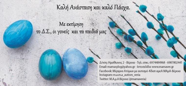 Βέροια Πασχαλινές ευχές από τη Μέριμνα Ατόμων με Αυτισμό (ΜΑμΑ) Faretra.info 24/04/2021, 00:19 Share on Facebook Share on Twitter Send with mail Φαρέτρα ΜΑμΑ Πασχαλινές ευχές ΣΧΕΤΙΚΑ ΑΡΘΡΑ Δεν υπάρχουν σχετικά άρθρα.