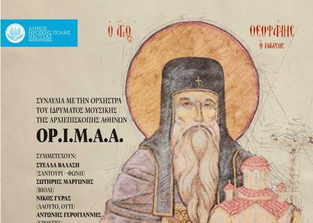 Ο Δήμος Ηρωικής Πόλης Νάουσας προς τιμήν του Πολιούχου Οσίου Θεοφάνους, τον οποίο η πόλη μας τιμά στις 19 Αυγούστου, διοργανώνει πολιτιστική εκδήλωση υπό την αιγίδα της Ιεράς Μητρόπολης Βεροίας, Ναούσης και Καμπανίας.