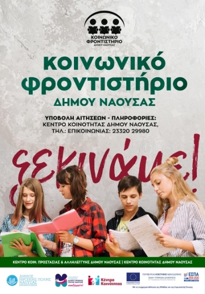 Ξεκινούν οι εγγραφές στο Κοινωνικό Φροντιστήριο του Δήμου Νάουσας, υπό την αιγίδα του Νομικού Προσώπου «Κέντρο Κοινωνικής Προστασίας και Αλληλεγγύης Δήμου Νάουσας», το οποίο ανταποκρινόμενο στην αγωνία των γονέων της πόλης, οι οποίοι δυσκολεύονται να αντιμετωπίσουν το κόστος της φροντιστηριακής δαπάνης, θα επαναλειτουργήσει και φέτος το κοινωνικό φροντιστήριο για τους μαθητές Γυμνασίου και Λυκείου.