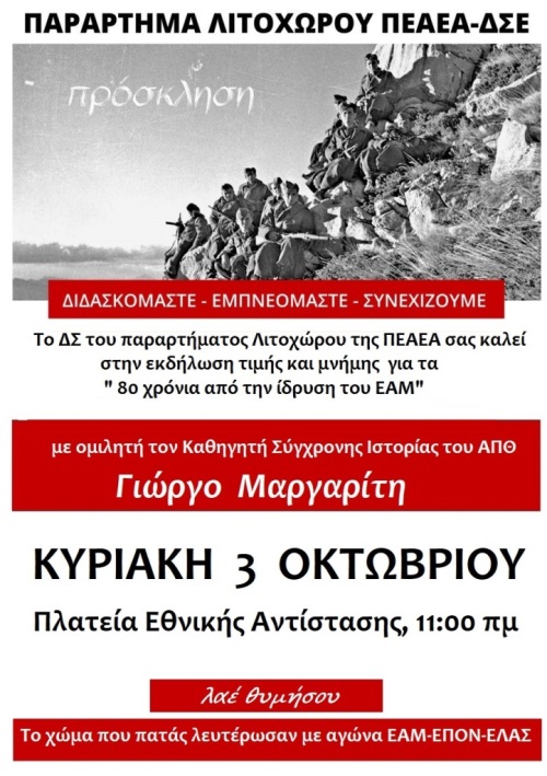 Εκδηλώσεις Κοινωνία ΠΕΑΕΑ-ΔΣΕ Παράρτημα Λιτοχώρου: Εκδήλωση μνήμης και τιμής για τα “80 χρόνια από τη ίδρυση του ΕΑΜ”, Κυριακή 3 Οκτωβρίου Faretra.info 30/09/2021, 09:49 Share on Facebook Share on Twitter Send with mail Φαρέτρα Γιώργος Μαργαρίτης ΕΑΜ ΠΕΑΕΑ-ΔΣΕ Λιτοχώρου ΣΧΕΤΙΚΑ ΑΡΘΡΑ Δεν υπάρχουν σχετικά άρθρα.