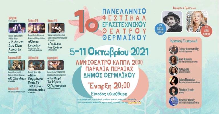 Η γιορτή του ερασιτεχνικού θεάτρου έρχεται στο Δήμο Θερμαϊκού! Πέντε ομάδες από την Ελλάδα και την Κύπρο θα παρουσιάσουν τη δουλειά τους και θα διεκδικήσουν τα βραβεία του 1ου Πανελλήνιου Φεστιβάλ Ερασιτεχνικού Θεάτρου Θερμαϊκού από την Τρίτη 5 έως και τη Δευτέρα 11 Οκτωβρίου 2021 στο Αμφιθέατρο ΚΑΠΠΑ 2000 στην Περαία.